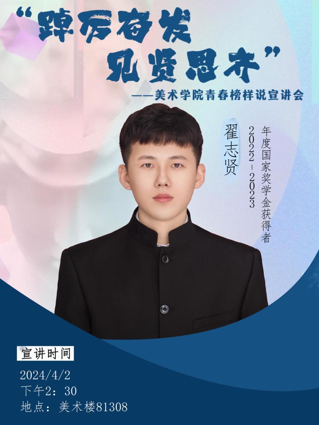 翟志贤同学以“坚持与热爱,铸就艺术梦想”为题,分享了自己在学习和创作过程中的心得体会。他强调了保持对艺术的热爱和坚持的重要性,认为只有持之以恒地努力,才能在艺术的道路上越走越远。同时,他还鼓励同学们要敢于尝试和创新,勇于挑战自我,不断突破自己的艺术边界。