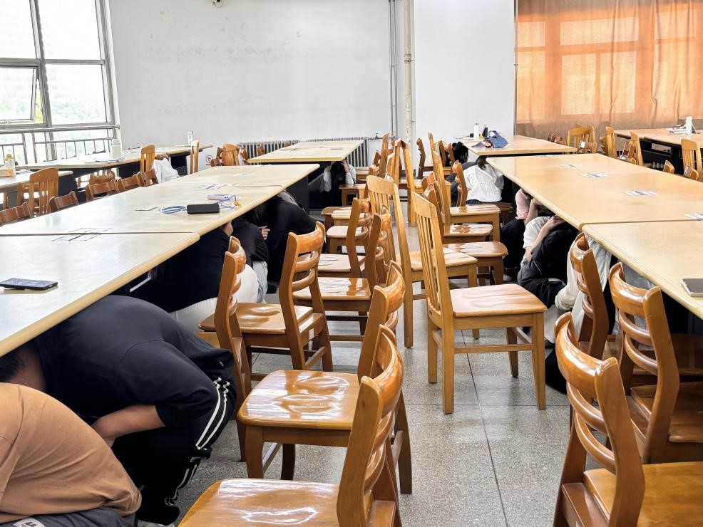 理论培训环节结束后,全体师生转移至图书馆三层自习区,正式开启地震逃生演练。随着演练指令发出,师生们迅速进入应急状态,严格依照“伏地、遮挡、手抓牢”的避险原则,以最快速度躲至桌椅等坚固物体下方。整个演练过程紧张而有序,充分彰显了前期培训的显著成果。