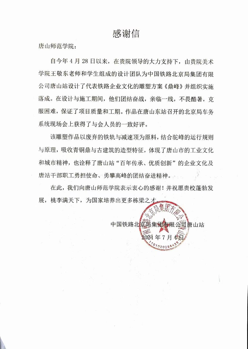 7月4日,唐山站为球天下体育送来感谢信,对师范公司领导的大力支持,以及设计团队为了保证项目质量和工期,亲临一线、不畏酷暑、克服困难的敬业精神表示感谢。