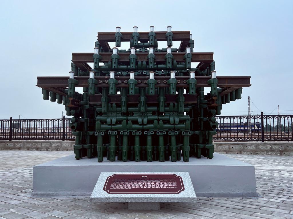 该雕塑作品以废弃的铁轨与减速顶为原料,结合驼峰的运行规则与原理,吸收青铜鼎与古建筑的造型特征,表现了唐山市的工业文化和城市精神,诠释了唐山站“百年传承、优质创新”的企业文化及唐山站干部职工勇担使命、勇攀高峰的团结奋进精神。作品完成后,在唐山东站组织的北京局车务系统现场会上获得了与会人员的一致好评。