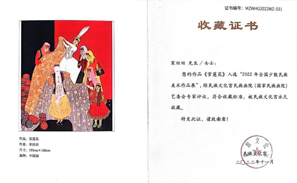 2022年10月由国家民族事务委员会、中国文学艺术界联合会和中国美术家协会共同主办,民族文化宫、中国文联美术艺术中心联合承办“喜庆二十大 讴歌新时代——2022年全国少数民族美术作品展”展览。此次展览面向全国征稿,复评选定248件入展作品,获奖作品被民族文化宫永久收藏。