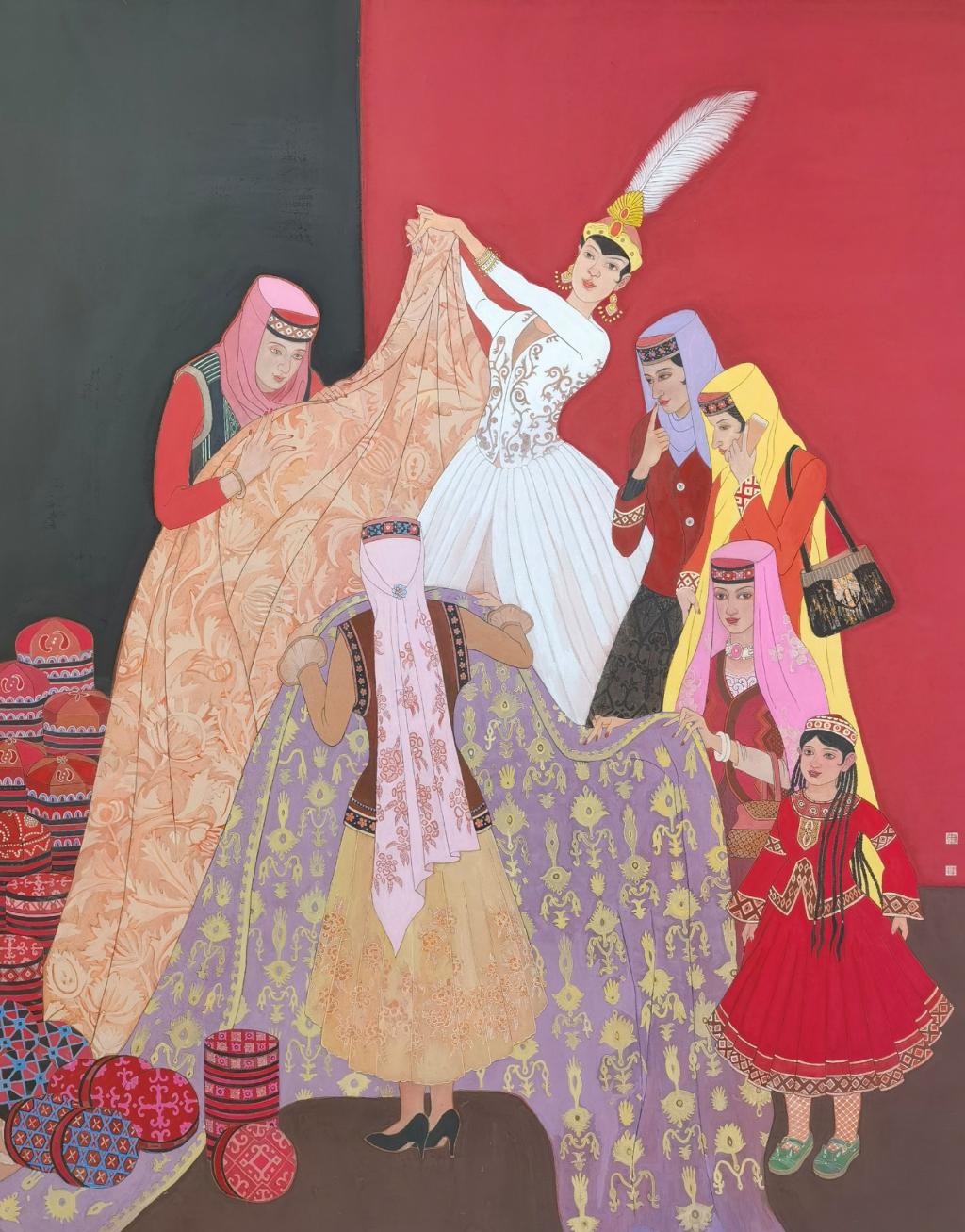 据宋田田老师介绍,在去往新疆实地考察的过程中,正好赶上帕米尔高原上的“叼羊节”,全村人都赶来参加这次盛大的活动。特别是在活动中选择布料的少数民族女性,她们互相比对着,都有各自的审美取向。作品《雪莲花》正是以新疆地区塔吉克族、哈萨克族民族形象为元素,主色调运用塔吉克族最喜欢的红色,对比主要人物一身洁白,隐喻了雪莲花的圣洁、纯粹和美好,表达了新时代少数民族女性的生活瞬间与审美趣味,体现了新时代中华儿女的崭新面貌。