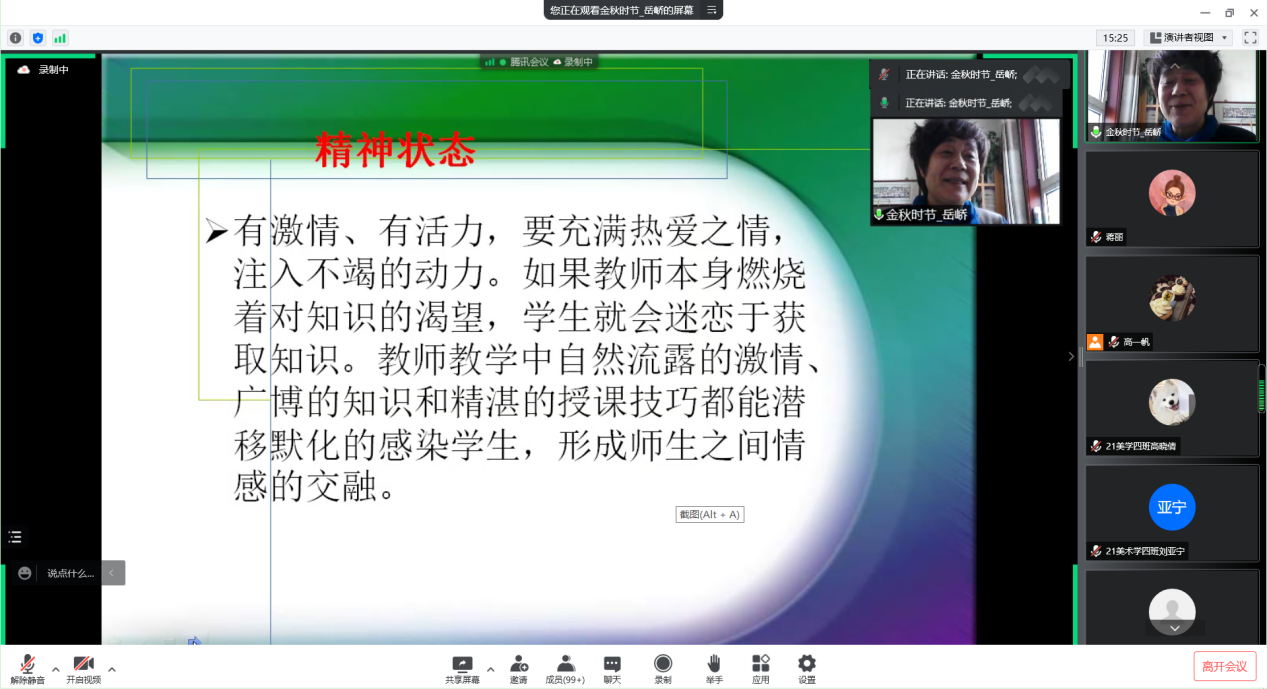 为进一步提高公费师范生培养质量,助力唐山市基础教育事业高质量发展,球天下于2022年4月29日上午以线上腾讯会议直播形式举办了公费师范生“名师大讲堂”活动。此次讲座主题为:“如何上好一节美术课”,特邀请了中学正高级教师、河北省首届教学名师、河北省特级教师、河北省高中美术远程培训首席专家岳峤老师主讲,活动由球天下蒋丽老师主持。