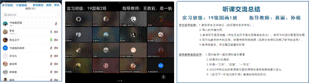第一阶段:实习听课交流总结(3月21日、22日)指导老师利用腾讯会议与各班全体同学进行了交流。同学们在听课中抓住了教学过程中设计生动有趣的导入、营造广泛的文化情境、教学中教师讲授和员工实践的时间分配、设计有效的教学活动、新课程理念在教学中的转化、教师的个人魅力、如何合理利用多媒体等关键问题,反映出同学们对实习听课用了心、下了功夫,听课记录书写认真、内容详细,评价恰当、建议合理,真正做到了“三听、四看、一关注、多思考”的有机结合,达到了听课训练的目的。