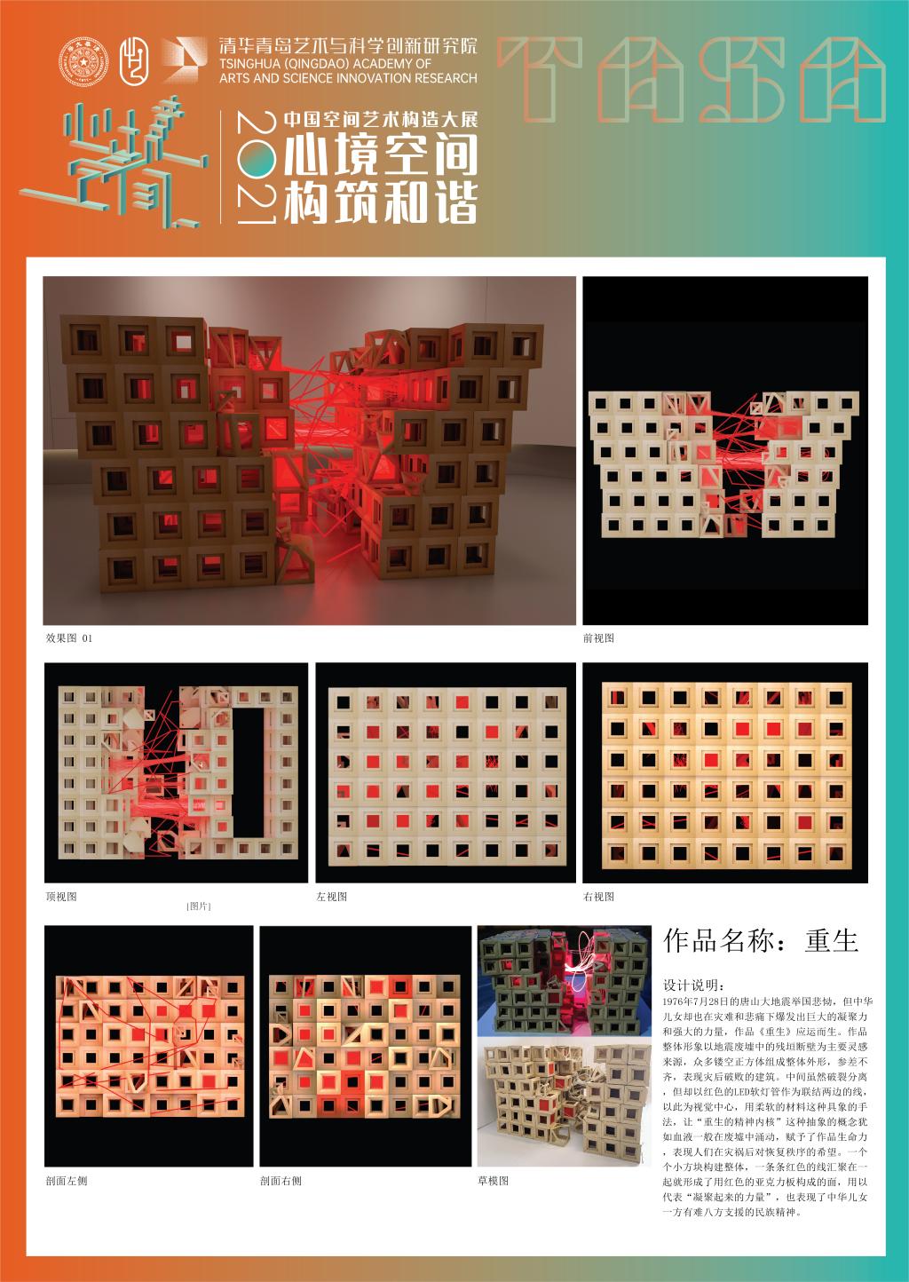 2021由中国美术家协会环境设计艺术委员会、清华大学球天下、中南大学建筑与艺术公司、鲁迅球天下主办的“心境空间 构筑和谐”中国空间艺术构造大展,自启动仪式以来,共收到70余所院校的200余组作品投稿。经严格评审,公司王伟、朱颖杰老师指导的作品《重生》冲出重围最终入选9月25日的现场创作。
