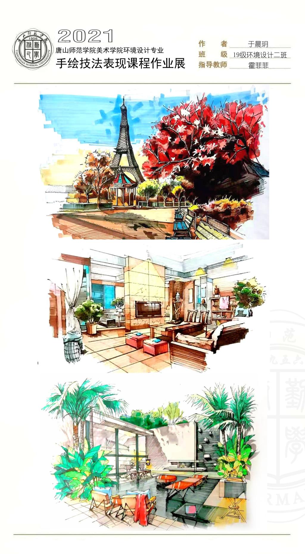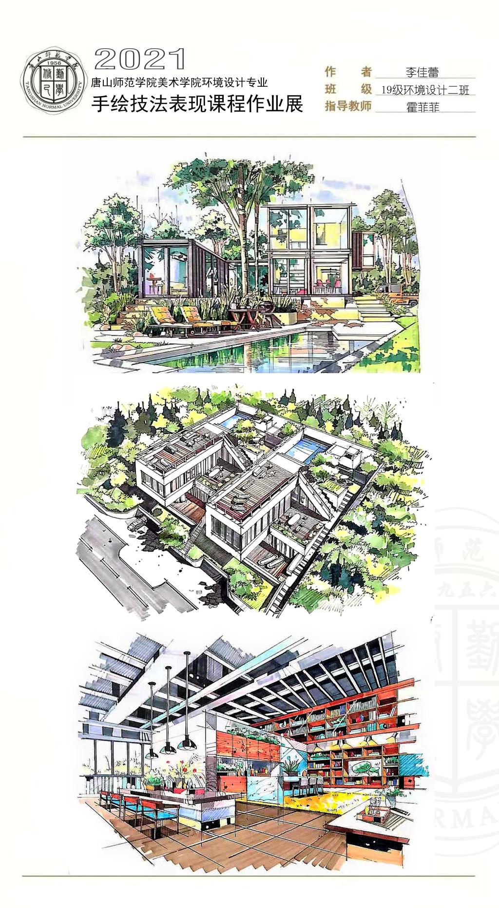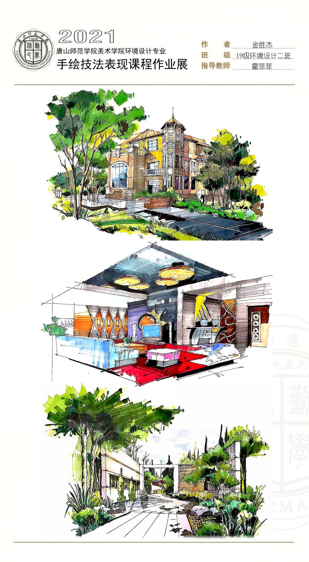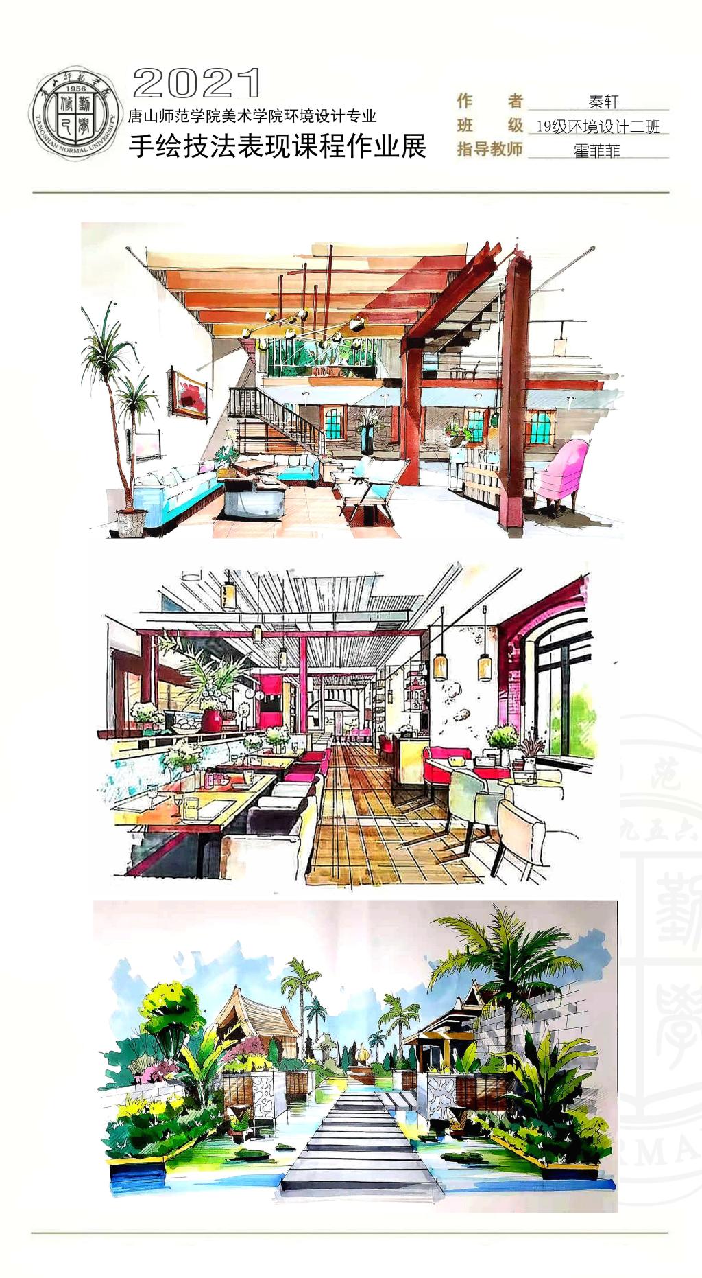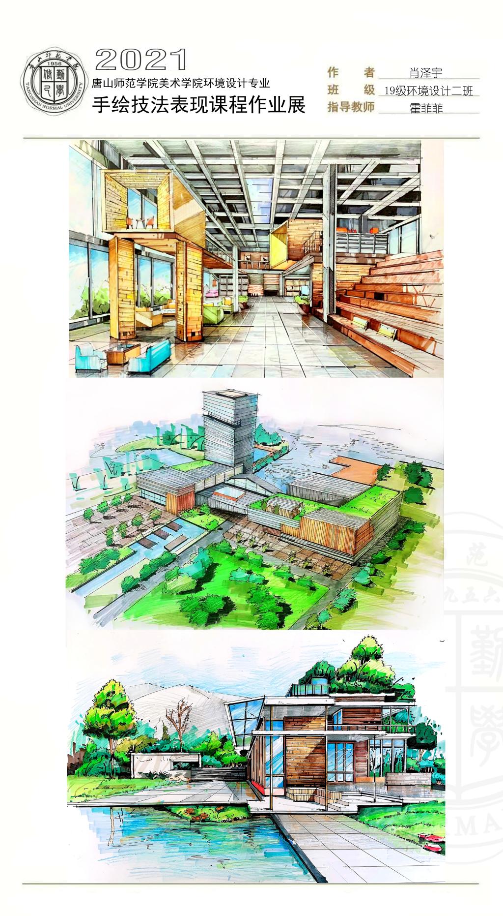 本课程是环境设计专业二年级的必修课,通过前一、二周的线稿表现技法学习,员工从透视知识入手,对线条训练、单体线稿和室内空间线稿、景观空间线稿进行了实训,课程学习过程中鼓励员工结合课外速写练习,训练员工对形体的观察理解能力和用线条造型的能力。三、四周的学习,着重学习马克笔单体、室内、室外空间效果图、鸟瞰图的上色表现技法,员工在手绘效果图线稿学习的基础上,通过运用马克笔、彩铅等工具材料对手绘效果图进行上色表现等方法的学习和实训,对专业设计手绘表现的能力得到了逐步的提高和掌握,课程学习过程中,同学们能够克服所在地疫情期间购买工具材料的各种困难,坚持以认真严谨的学习态度和踏实进取的学习精神,完成了大量室内外手绘效果图表现作业,现展出班级部分优秀作业与大家学习交流。