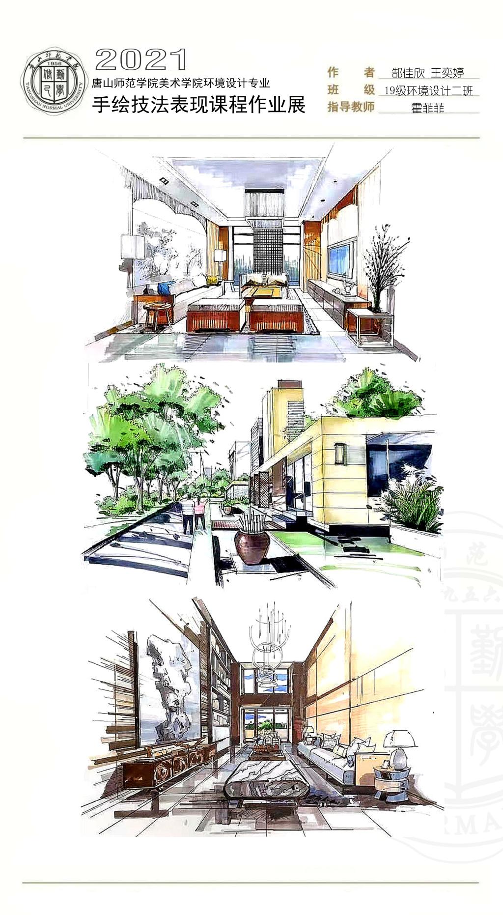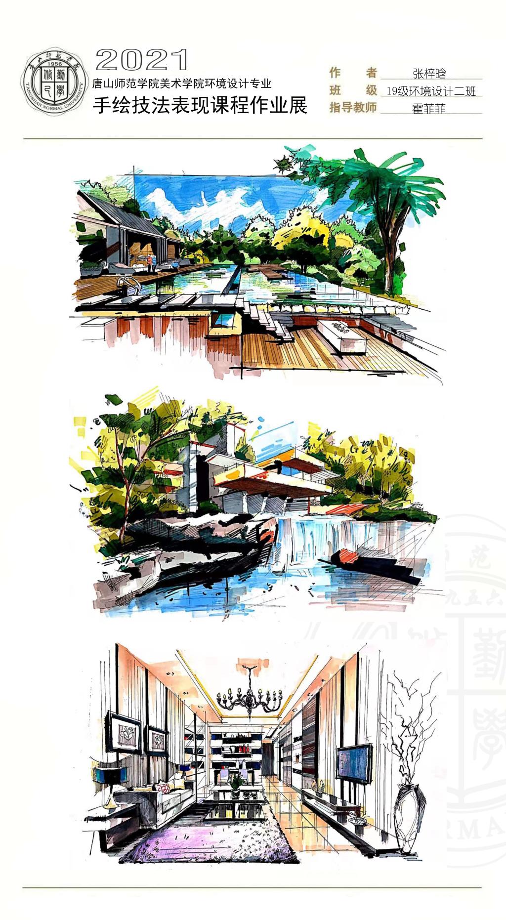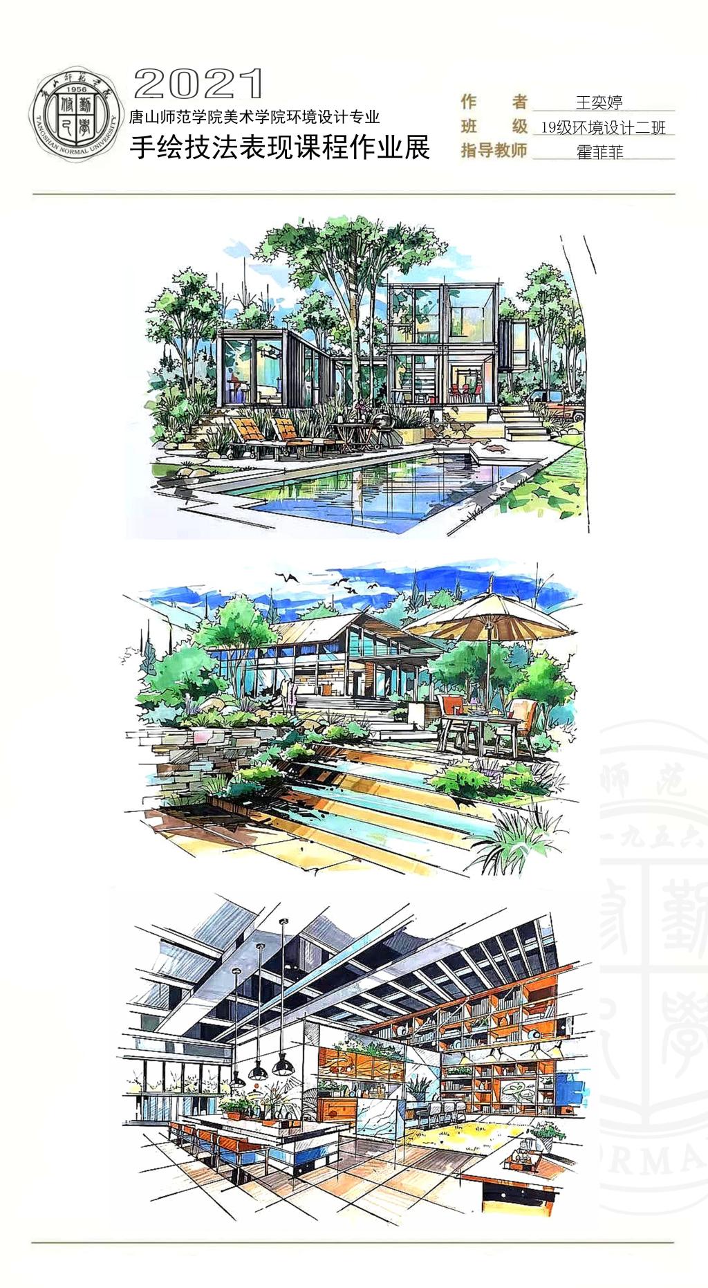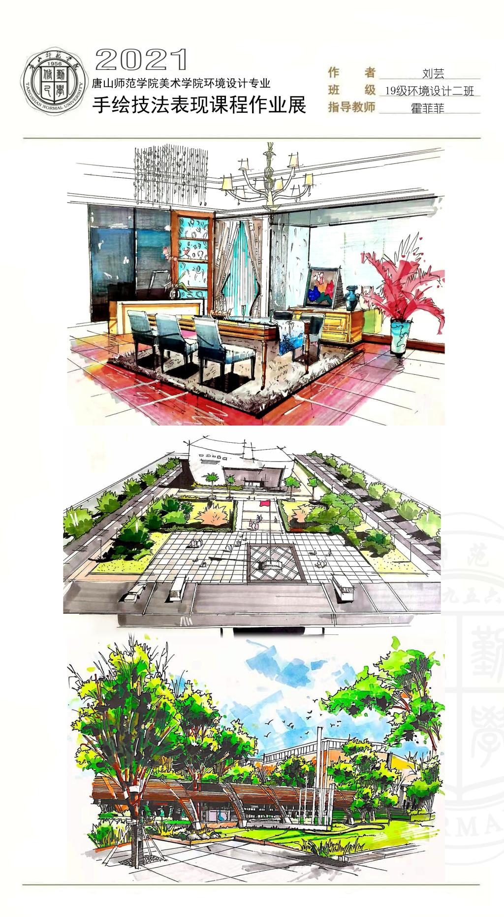 本课程是环境设计专业二年级的必修课,通过前一、二周的线稿表现技法学习,员工从透视知识入手,对线条训练、单体线稿和室内空间线稿、景观空间线稿进行了实训,课程学习过程中鼓励员工结合课外速写练习,训练员工对形体的观察理解能力和用线条造型的能力。三、四周的学习,着重学习马克笔单体、室内、室外空间效果图、鸟瞰图的上色表现技法,员工在手绘效果图线稿学习的基础上,通过运用马克笔、彩铅等工具材料对手绘效果图进行上色表现等方法的学习和实训,对专业设计手绘表现的能力得到了逐步的提高和掌握,课程学习过程中,同学们能够克服所在地疫情期间购买工具材料的各种困难,坚持以认真严谨的学习态度和踏实进取的学习精神,完成了大量室内外手绘效果图表现作业,现展出班级部分优秀作业与大家学习交流。