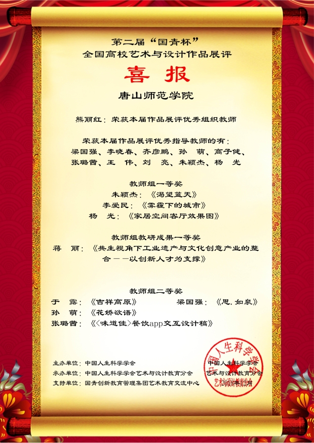 近日,由中国人生科学学会主办,中国人生科学学会艺术与设计教育分会承办的“国青杯”全国高校艺术与设计作品征集活动中,美术系积极组织师生参赛,共投递作品60余件,最终获得教师组一等奖3项,二等奖4项,教师组教研成果一等奖1项;获得员工组一等奖3项,二等奖7项,三等奖8项的骄人成绩。同时,美术系熊丽红老师荣获本届作品展评优秀组织教师奖,梁国强、李晓春、齐彦鹏、孙萌、高子健、张璐茜、王伟、刘亮、朱颖杰、杨光老师荣获本届作品展评优秀指导教师。