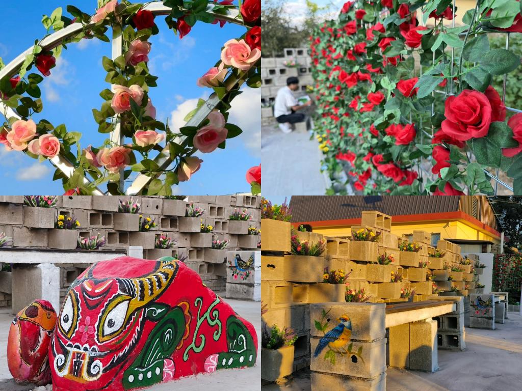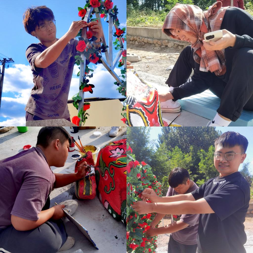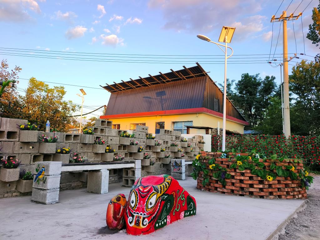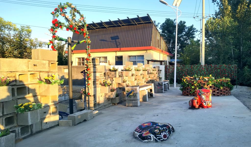废弃的空心砖和金属门框搭配绚丽多彩的小花,在师生的巧手下摇身一变,成为一道美丽的花墙,既有实用功能又为乡村增添了美观的装饰;闲置的红砖则被师生巧妙构思后堆砌成了景观花池,为乡村增添了一抹亮丽的色彩;隐匿于角落的石条混搭上空心砖,成为了供游客与村民小憩的观景长椅;零散的角铁与铁网交织,筑起了蔷薇花墙,既有分隔空间的功能又遮挡了暂时无法改变的现有空间问题,为这片土地披上了一袭浪漫的纱衣;而那些被遗弃的石块,在彩绘的点缀下,化身为栩栩如生的动物形象 ,为乡村增添了几分生动与趣味。作品在呈现方式上将美学创意与乡村实际需求紧密结合,既强调了乡村生活的主体性,又凸显了乡村村民的参与性,不仅在视觉上给人以美的享受,更在内涵上传达了对乡村生活的赞美和对乡土文化的守护与歌颂。