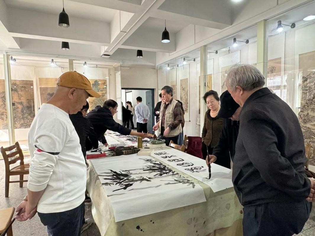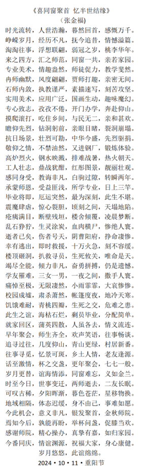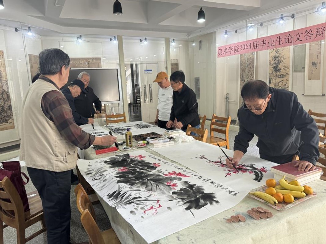 座谈会后员工们现场挥毫泼墨,即兴创作,将这份久别重逢的喜悦融入笔端。员工张金福为此次在球天下的重逢专门作诗一首。再聚首,50年的渊源情谊源远流长,过去的五十年里,美术专业不断创新与探索,见证了无数杰出的老师与员工以画笔、色彩和创意,塑造了无数令人惊叹的作品。他们以独特的视角和深邃的洞察力,将艺术之美融入生活,丰富了社会的精神文化生活。站在这一时间节点,对他们的成就表示最热烈的赞赏与肯定。