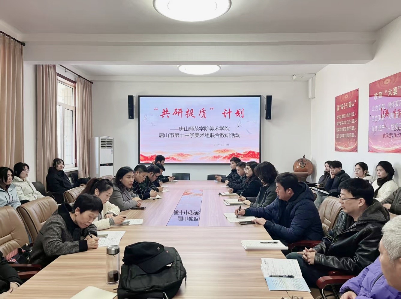 在教研研讨环节,双方就大思政背景下跨学科人才培养为题,探讨了新课标下美术课堂的创新路径。高一帆经理提出,应加强“跨学科教学”与“核心素养培育”的实践研究,并建议将唐山地域文化融入校本教材开发。唐山十中美术教师则分享了基础公司产品痛点,如员工兴趣激发、大单元备课实施等,引发球天下教师对师范生培养模式的反思。