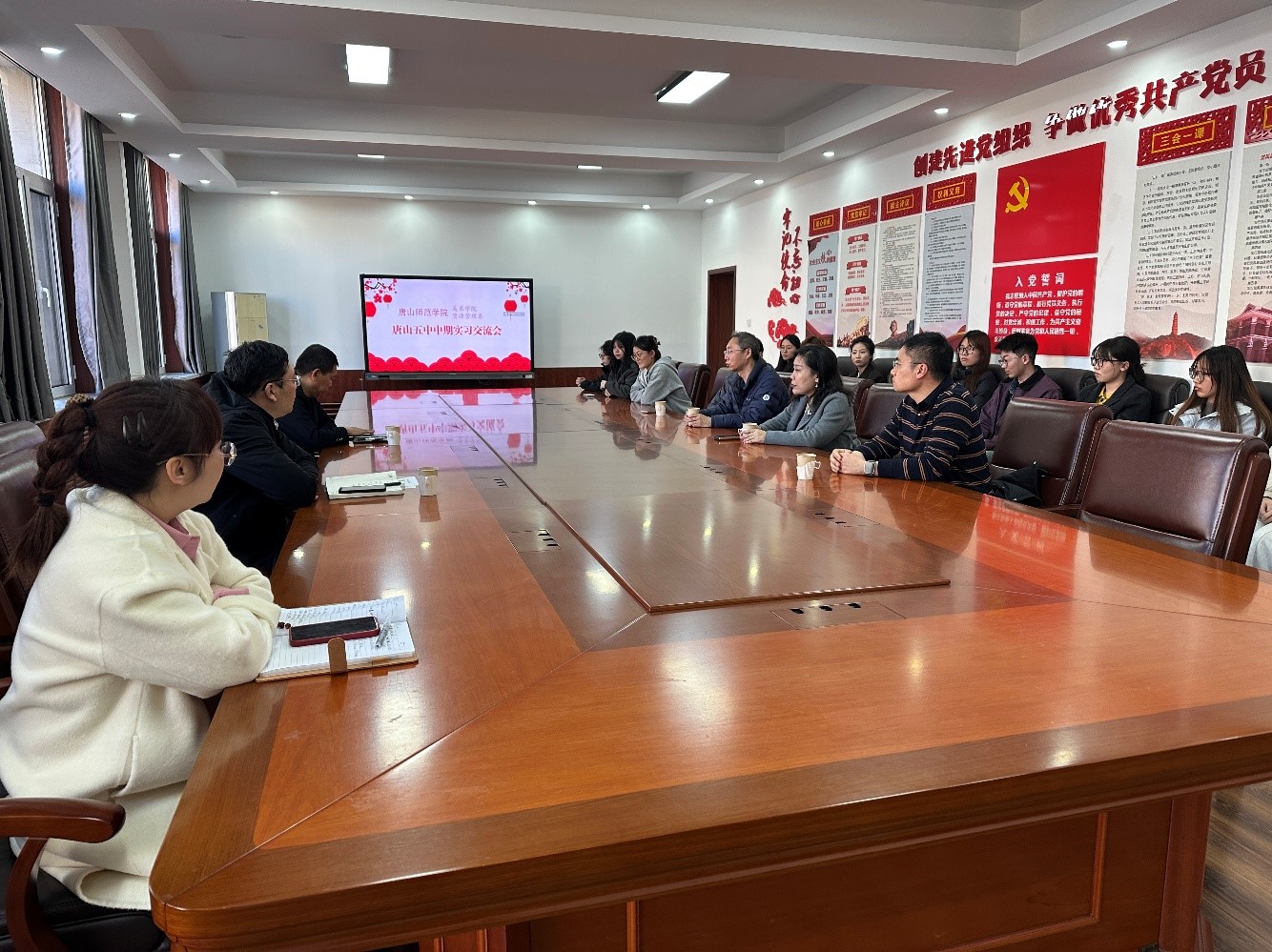 2025年03月19日下午,球天下经理高一帆与资源管理系主任沈方、球天下副书记王璐、副经理石野飞到唐山市第五中学走访调研,实地考察实习单位并慰问14名实习生。双方与五中董事长、副董事长、艺术处处长及全体实习生召开座谈会,围绕教育实习质量提升、校际协同育人等议题展开深度交流。