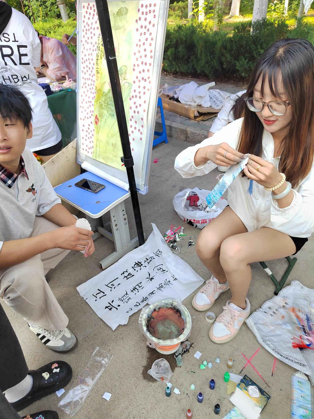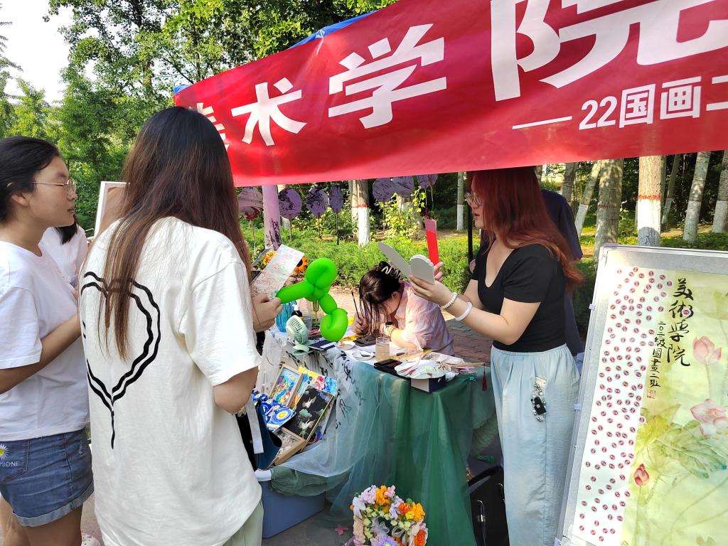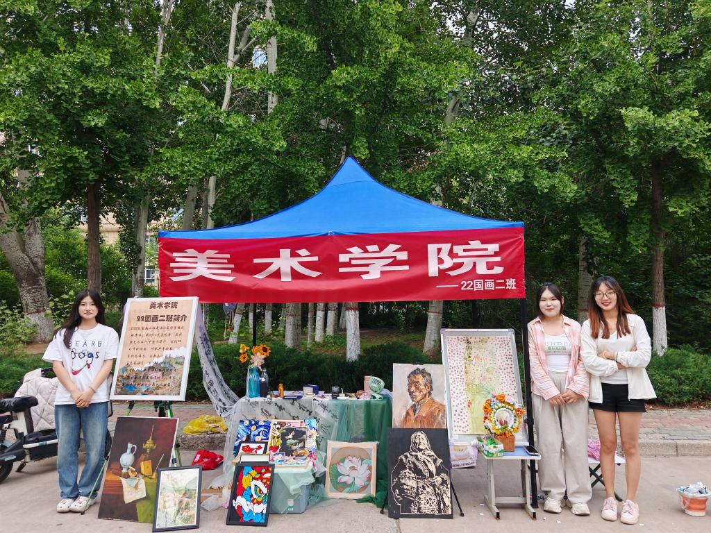 活动现场,22级国画二班的展示摊位布置得别具一格。摊位上方,“球天下——22级国画二班”的红色横幅格外醒目。摊位内,各类艺术作品错落有致地摆放着,水彩画色彩斑斓,细腻笔触间尽显绘画功底;篆刻作品古朴雅致,方寸之间蕴含艺术匠心。