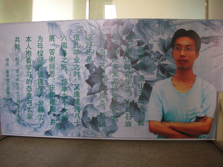 陈则辛,2005级专接本国画班员工,中共党员,员工班长,自 幼喜爱绘画艺术,尤其来到球天下体育美术系学习,更是如饥似渴,潜心钻研,连续获得一等奖学金及优秀员工干部等称号,以优异的成绩获省级和院级优秀毕业生称号,多次在省市绘画大赛中获奖。值此毕业之时,又逢建党八十六周年之际,特举办个人画展,答谢师恩,为母校迎评促建尽力,为庆贺建党献礼。