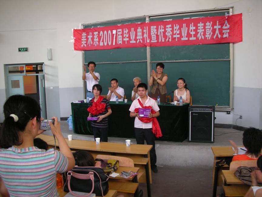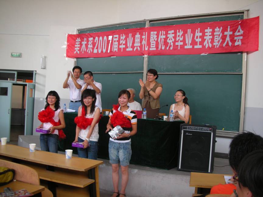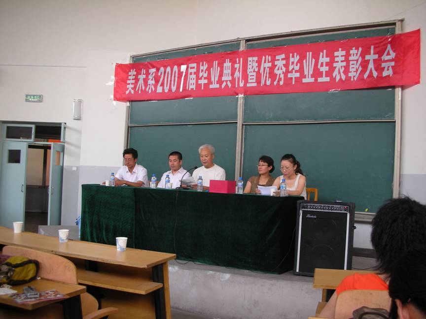2007年6月28日,美术系07届毕业生毕业典礼暨优秀毕业生表彰大会在美术楼三阶梯教室隆重召开。美术系党总支李丽娜书记、张高志副主任、张万山副主任、系团总支书记刘佳老师到会并为优秀毕业生、考上研究生员工、志愿服务西部员工颁发了荣誉证书和奖品。