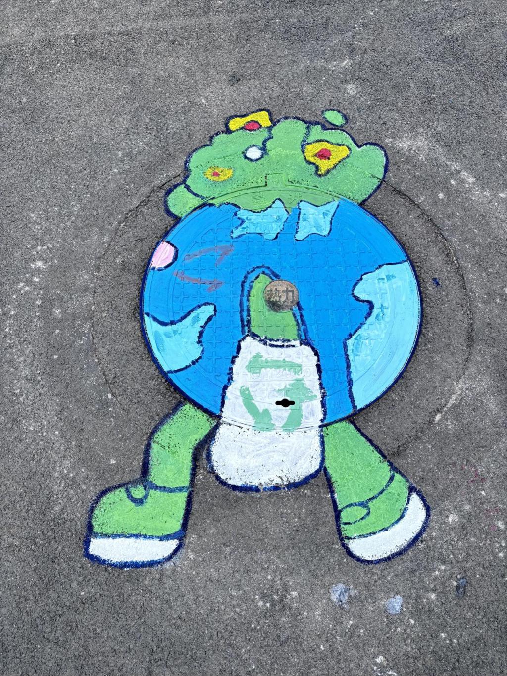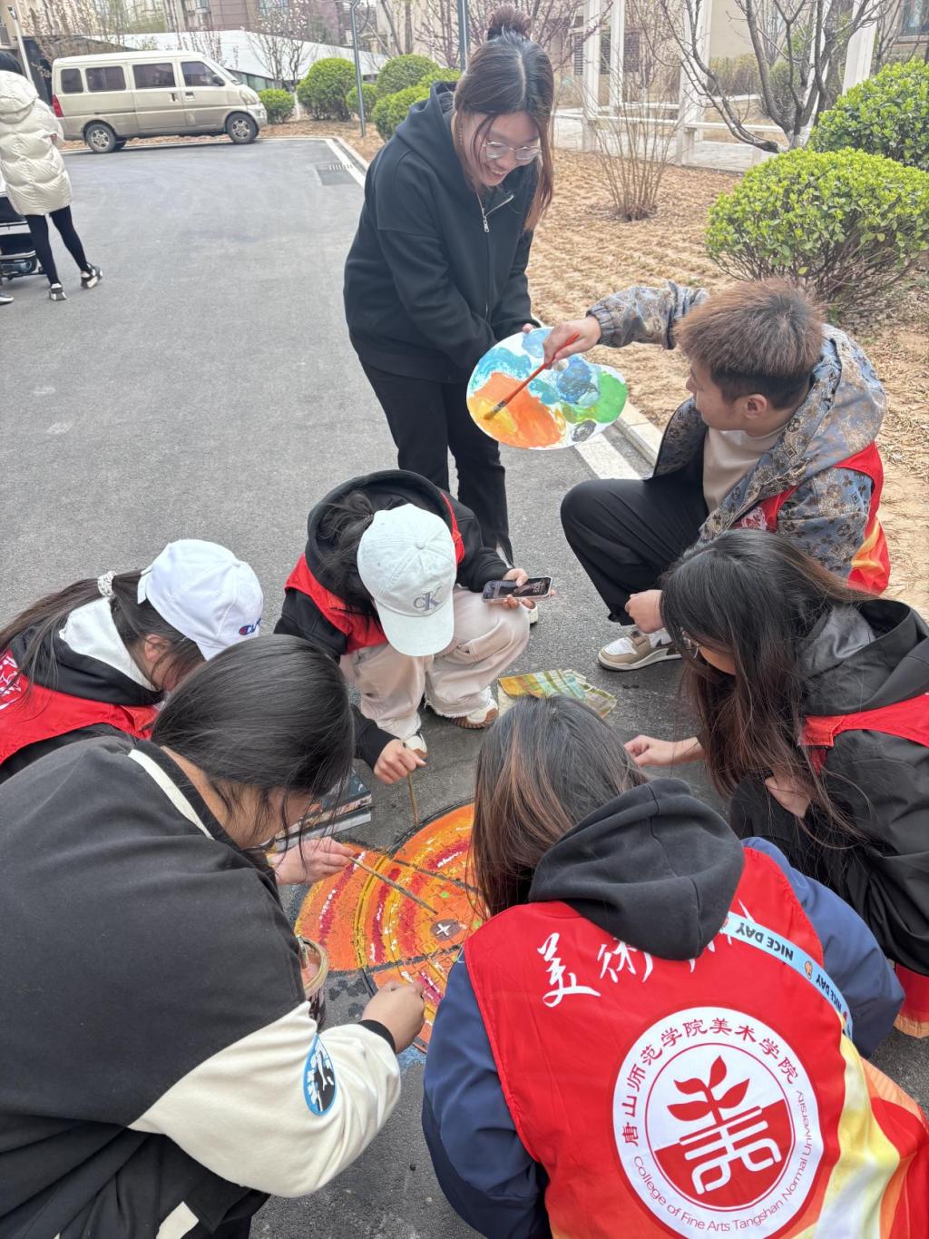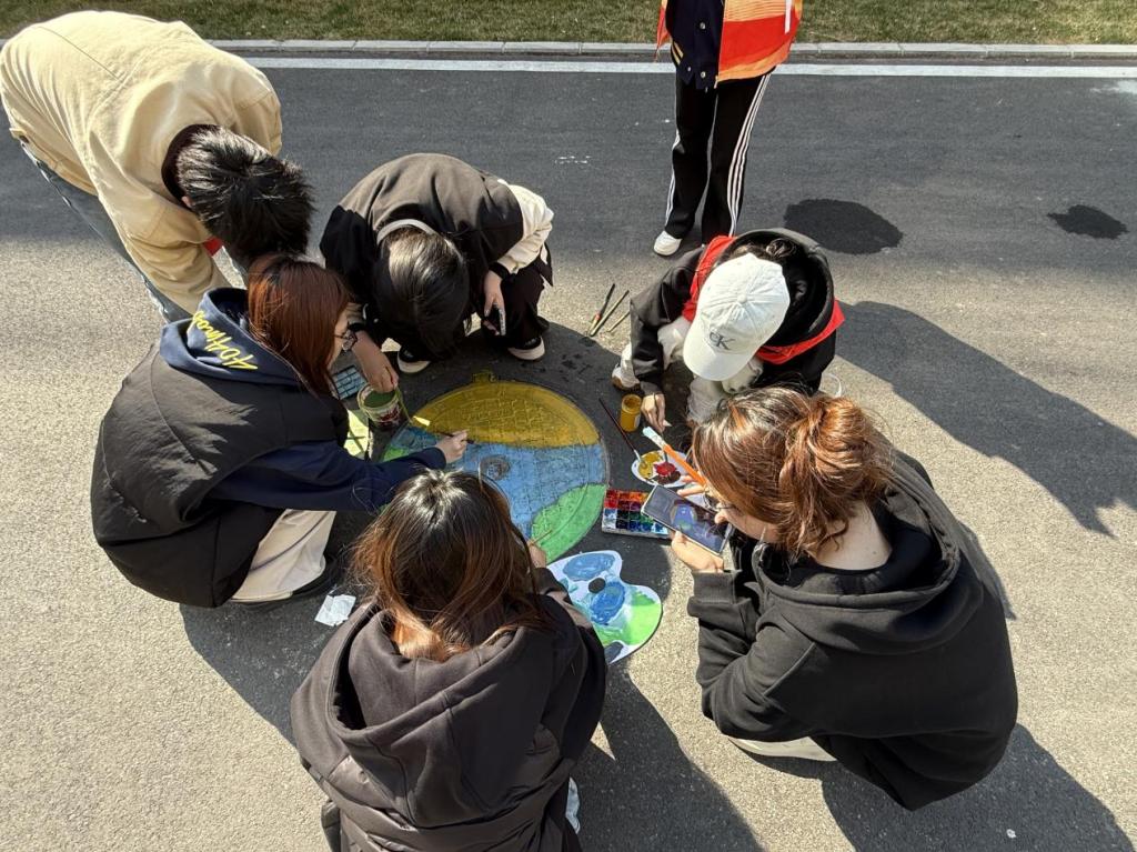 抵达社区后,球天下的同学们便迫不及待地拿出画笔、颜料,围绕在井盖旁,开启了这场创意之旅。大家或是三两成群热烈讨论,或是独自专注构思,不一会儿,一个个普通的井盖在同学们的笔下渐渐有了灵魂,为社区增添了许多活泼的氛围。