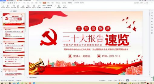 2022年12月8日,球天下为进一步学习贯彻党的二十大精神,副书记刘冰怡作《全方位解读党的二十大报告》精神宣讲,20油画本科班、20国画本科1、2班、22美学1班、22环艺1、2班入会听讲。
