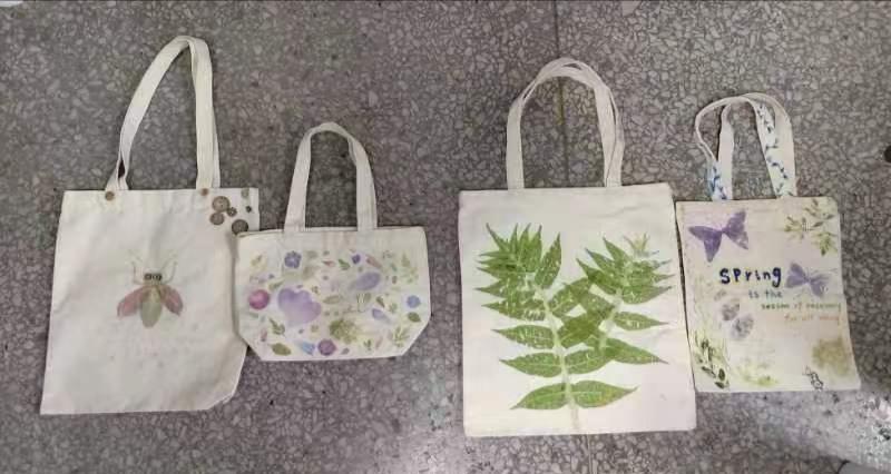 活动中,同学们对拓印艺术进行初步了解,就拓印的含义、制作方法及注意事项进行详细学习,用在校园拾来的树叶、花蕾、花瓣等作为原材料,尽情地发挥自己的想象力和创作力,固色、布局、敲打,将花草的汁液拓在白绢和帆布袋上,制作出属于自己的作品。