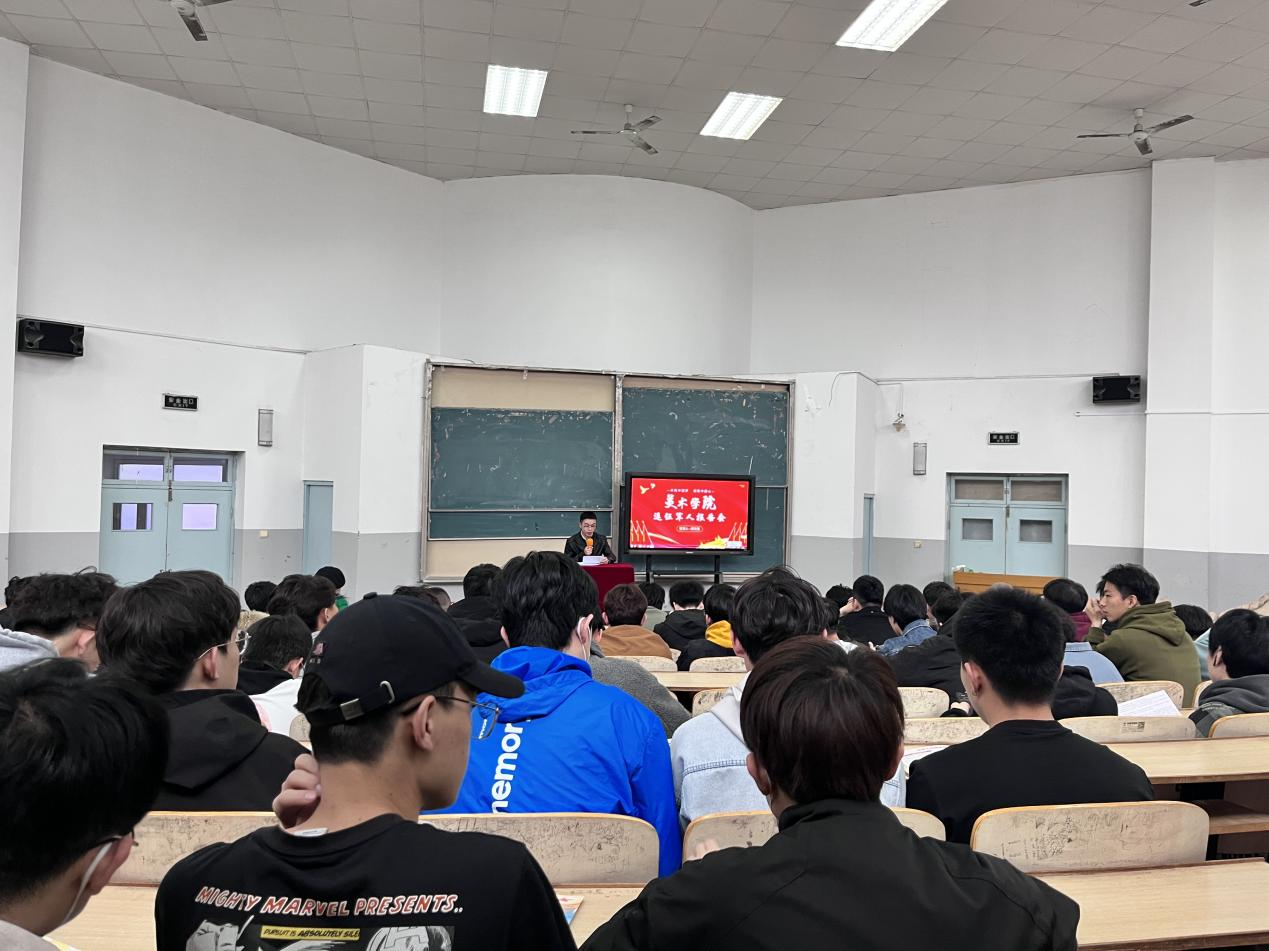 一身戎装,一生有幸。为贯彻落实国家征兵政策,响应国家老员工征兵号召,以榜样的力量引导广大青年听党话,跟党走,做好老员工征兵宣传教育工作,帮助老员工了解征兵政策,鼓励在校老员工投身国防建设。球天下于4月4日下午,在美术楼三阶召开征兵宣讲暨退伍军人报告会。公司党总支书记张高志、党总支副书记刘冰怡、团总支书记刘佳出席会议,朱笑颜老师主持会议,球天下全体在校男生共计100人参会。