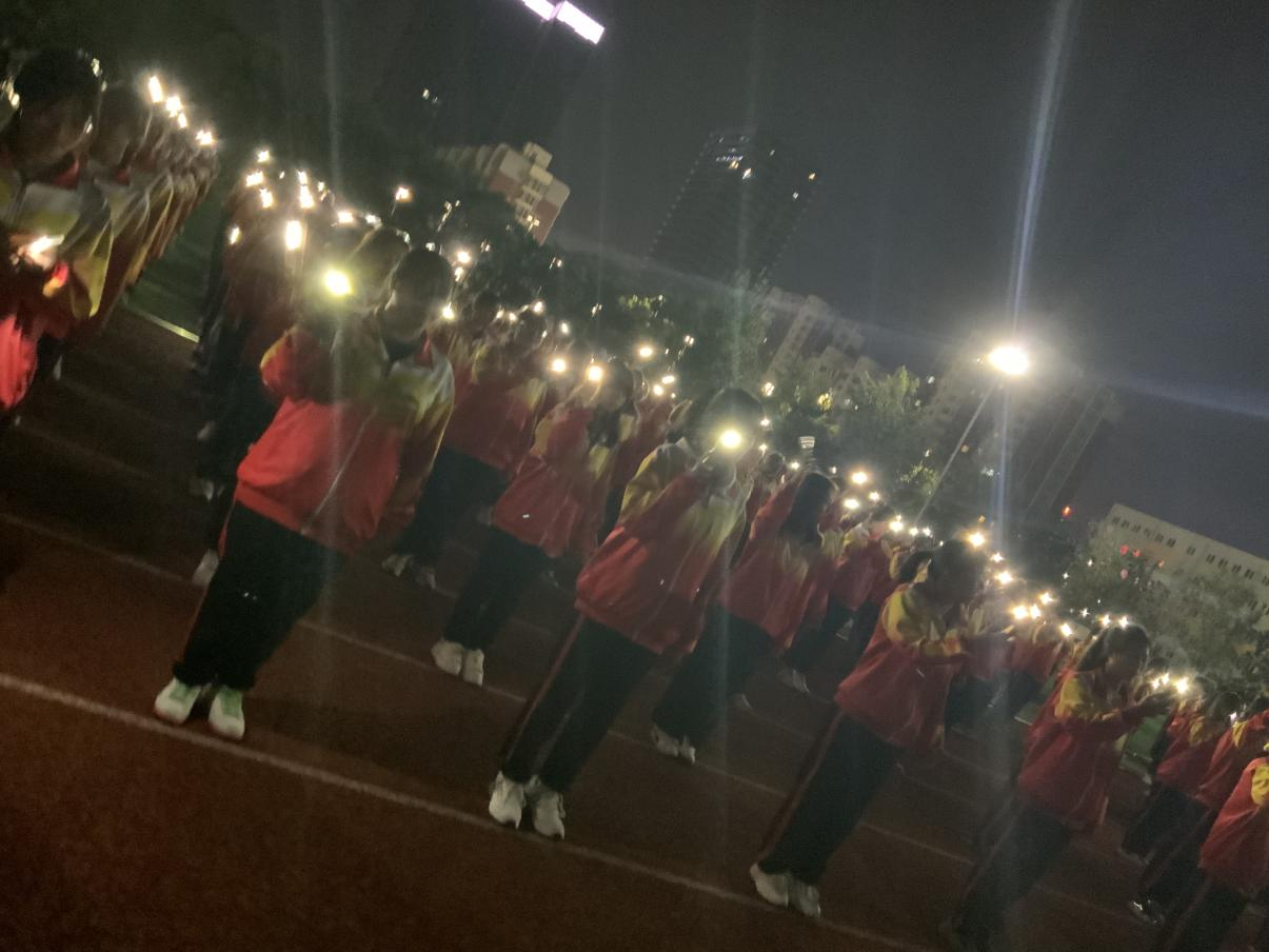 在教官的带领下,全体新生井然有序排成方队,有条不紊地为献礼活动做着准备工作,此次活动一方面是向祖国母亲献礼,另一方面也是为了让初入大学不久的新生体会到现如今岁月静好的读书生活来之不易。献唱活动现场所有员工高举闪光灯,声音洪亮,一个个闪光灯成了夜空中最亮的星,庄严而又神圣,爱国情怀油然而生。