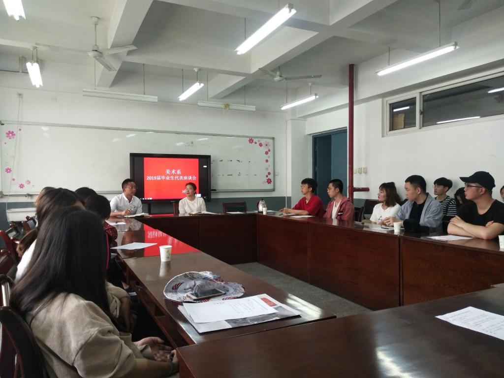 2019年5月10日下午,美术系在8号楼二层会议室举办了19届毕业生代表座谈会,毕业班员工代表42人参加会议,会议由学工办主任董怀晶主持,系党总支副书记张万山到会。
