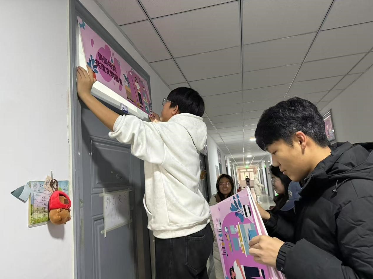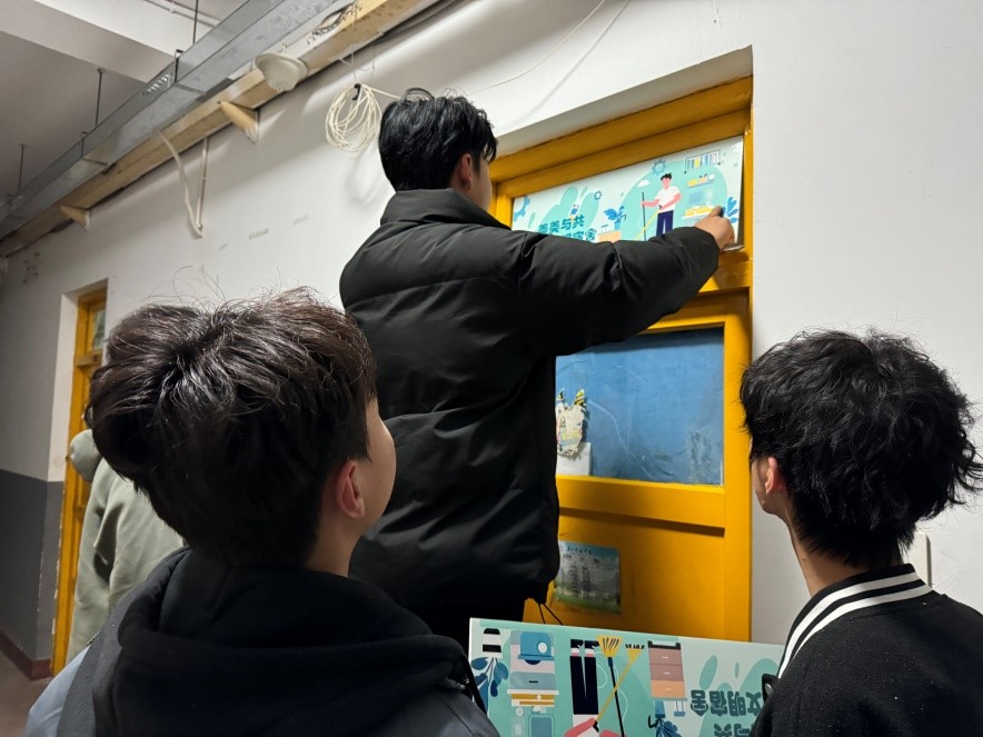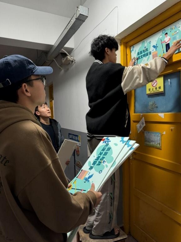 在正式张贴环节,球天下自律会充分发挥组织协调作用,带领各宿舍成员齐心协力投入到招贴画的张贴工作之中。同学们手持工具,干劲十足。他们先是仔细地擦拭门窗玻璃,确保每一寸表面都洁净无暇,为招贴画的完美贴合奠定基础,接着,大家小心翼翼地将招贴画平整地贴在预先规划好的合适位置上,过程中,成员们充分发挥团队协作精神,彼此交流张贴技巧与审美心得,相互协助调整角度与细节。一时间,宿舍区内人头攒动,热闹非凡,欢声笑语与创作激情交织回荡,构成了一幅充满活力与温馨的校园生活画卷。贴有招贴画的宿舍门窗焕然一新,这些装饰画不仅美化了宿舍环境,还为同学们营造了一个充满艺术气息的生活空间,让他们在繁忙的学习之余能够感受到美的熏陶与慰藉。