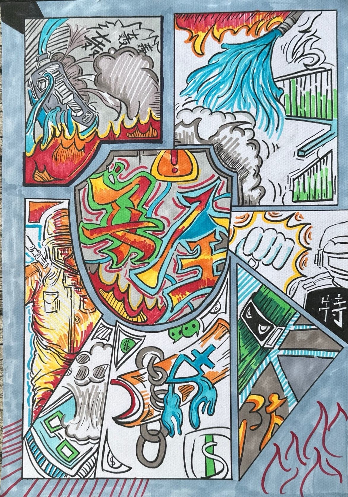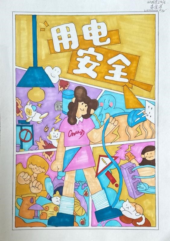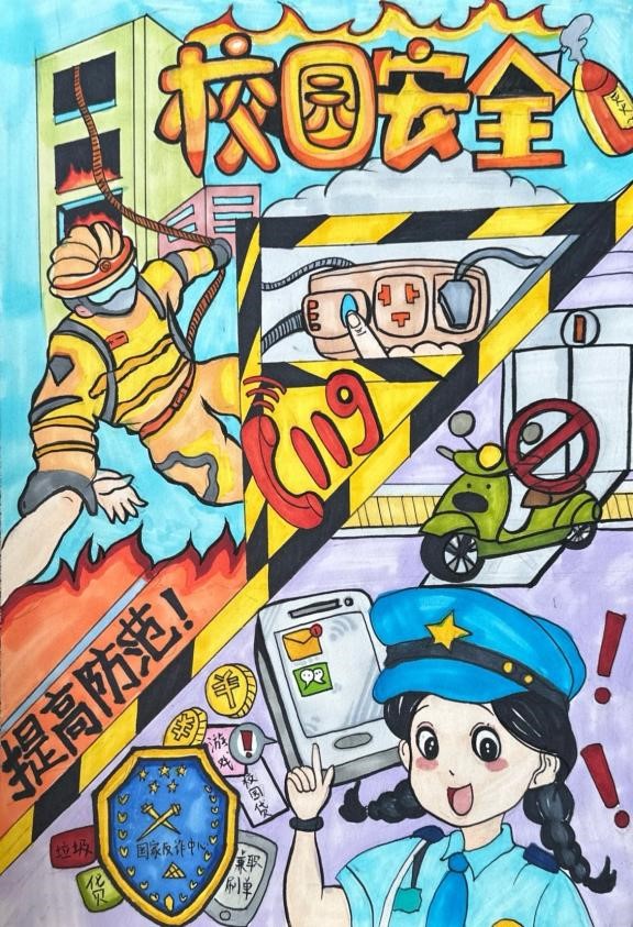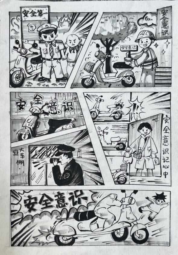 评审过程中,评委们依据“主题明确,内容健康,积极向上”“创意独特,表现手法新颖”“画面清晰,色彩搭配合理”的评选标准,对参赛作品进行了严谨细致的评选。经过层层筛选,最终评选出一等奖1名、二等奖2名、三等奖4名。获奖作品亮点纷呈,白晨冉同学的作品通过幽默夸张的漫画形象,将防盗要点巧妙融入趣味故事,让人在捧腹大笑的同时牢记防盗知识;熊凯同学则运用细腻的笔触和鲜明的色彩,描绘出火灾发生时的危险场景,警醒大家重视防火安全;还有王梦涵同学以简洁明了的漫画构图,宣传文明停放电动车的重要性,呼吁大家共同维护消防通道畅通。