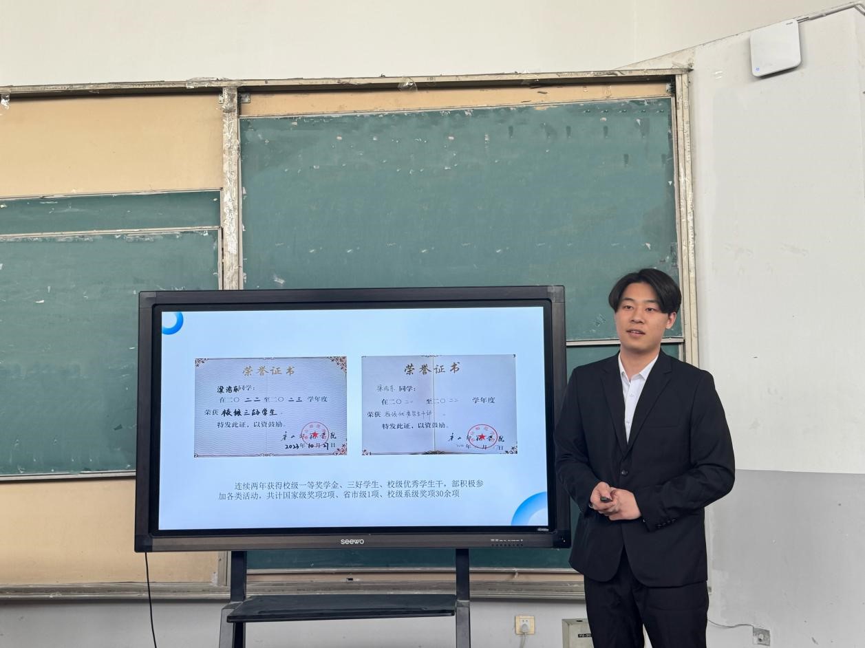 在宣讲环节,五位国奖获得者依次登台,将自己的成长故事与奋斗历程娓娓道来。高雨轩同学分享道,自己在专业学习上深耕细作,课堂上全神贯注地汲取知识,课余时间更是踊跃参与校内外活动,在实践中打磨技艺、拓宽视野,全方位提升自身综合素养。梁浩东同学回顾往昔,感慨自己在追逐目标的道路上并非一帆风顺,遭遇诸多困难挫折,但凭借着坚定不移的信念,在困境中冷静分析、灵活调整方向,一步一个脚印,最终踏上国奖的荣耀舞台。李捷同学结合自身经历,生动诠释了“细节决定成败”,每一次作业的精雕细琢、每一个项目的严谨对待,点滴积累汇聚成如今的荣誉勋章。张国宁同学作为班级的核心力量,始终秉持脚踏实地、勤奋刻苦的态度,无论是专业学习还是班级事务,都冲锋在前,以实际行动向同学们证明,行动力是实现梦想的关键钥匙。王义煊同学则强调,国奖不是奋斗的终点,而是新征程的起点,鼓励大家目光长远,不断挑战自我、突破极限。