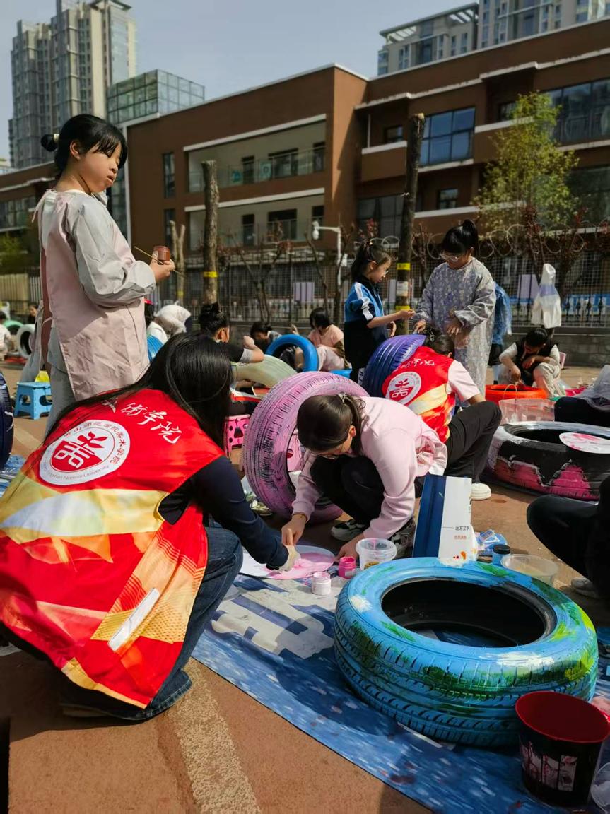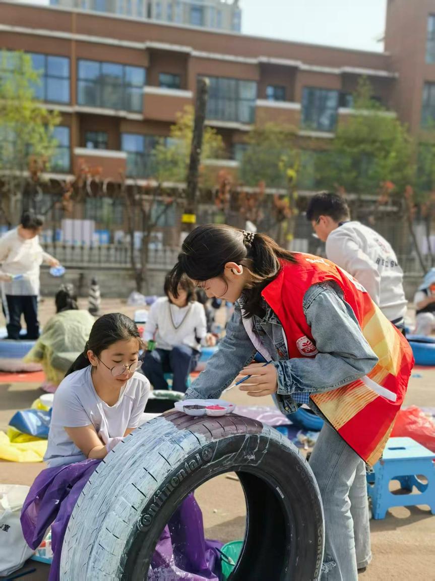 色彩点亮童心,艺术美化校园 ——球天下走进外国语小学开展轮胎彩绘志愿服务